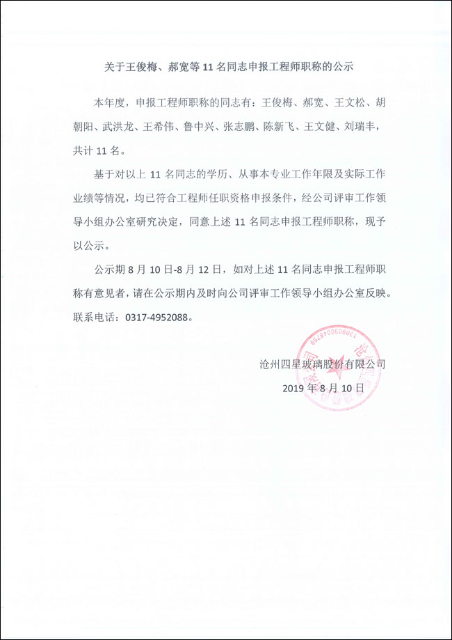 關(guān)于王俊梅、郝寬等11名同志申報(bào)工程師職稱的公示 |