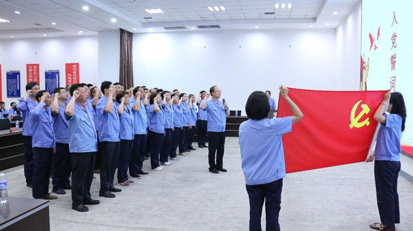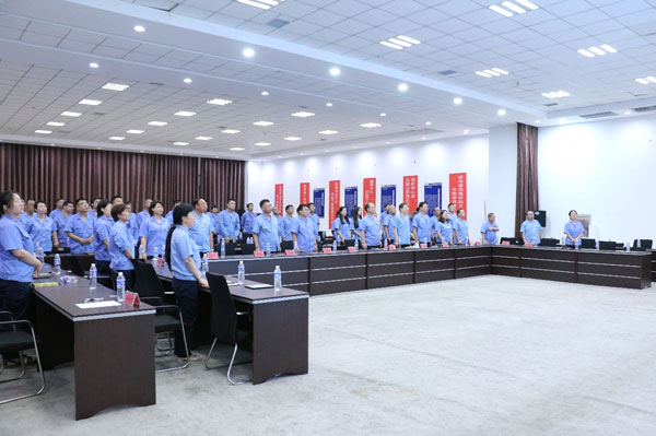(大會主會場) 同心跟黨走,奮進新征程。2024年7月13日下午,四星玻璃黨支部召開慶祝建黨103周年暨“學(xué)黨史悟初心強企業(yè)做先鋒”主題教育啟動大會。主會場設(shè)在紙房頭廠區(qū)總部二樓多功能會議室,前候廠區(qū)、光熱廠區(qū)、基地廠區(qū)等地設(shè)視頻分會場。公司黨支部書記、董事長王煥一出席會議,公司全體黨員、入黨積極分子、公司中層以上領(lǐng)導(dǎo)、科室人員等260余人參加會議。會議由黨支部書記王煥一主持。 (黨支部書記、董事長王煥一領(lǐng)誓) “起來,不愿做奴隸的人們……”在嘹亮而莊嚴的國歌聲中,大會正式開始!拔抑驹讣尤胫袊伯a(chǎn)黨,擁護黨的綱領(lǐng),遵守黨的章程……”在公司黨支部書記、董事長王煥一領(lǐng)誓下,全體黨員重溫入黨誓詞,堅定有力的聲音響徹全場。